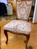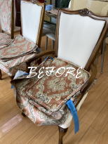 | 千葉県木更津市ダイニングチェア張替え アンティークダイニングチェアの張替えをさせて頂きました。 生地は2脚それぞれ異なる生地で張替えさせて頂いています。 |